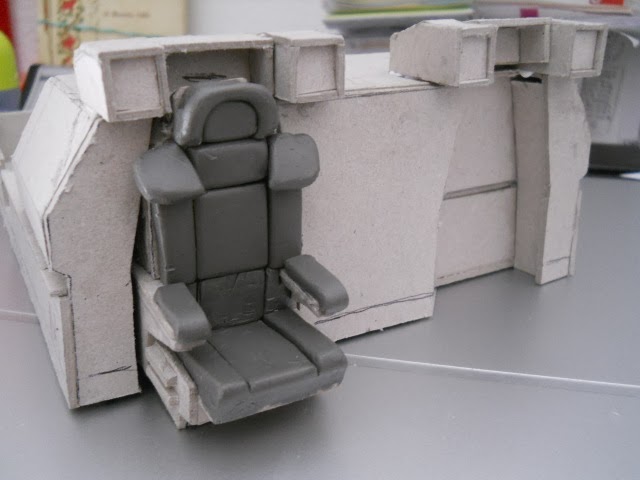 The seat was the first element created. A cardboard base and plastiline for seating. The idea was to make a model that could be duplicate for the six front seats and modified in a new model for the four rear seats because of a different design.